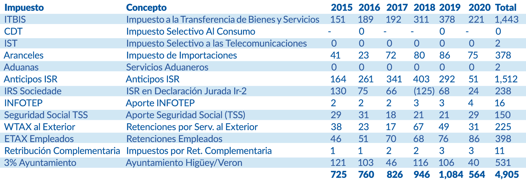 Los impuestos pagados por CEPM se concentran principalmente en ITBIS (transferncia de bienes y servicios), Impuesto sobre la Renta y pagos a los ayuntamientos, que totalizaron RD$1,443 millones (29%), RD$1,750 millones (36%) y RD$531 millones (11%), respectivamente durante el período 2015-2020.